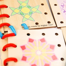 Les enfants font passer les ficelles à travers les trous et exercent la préhension, la coordination œil–main et la patience de façon ludique.