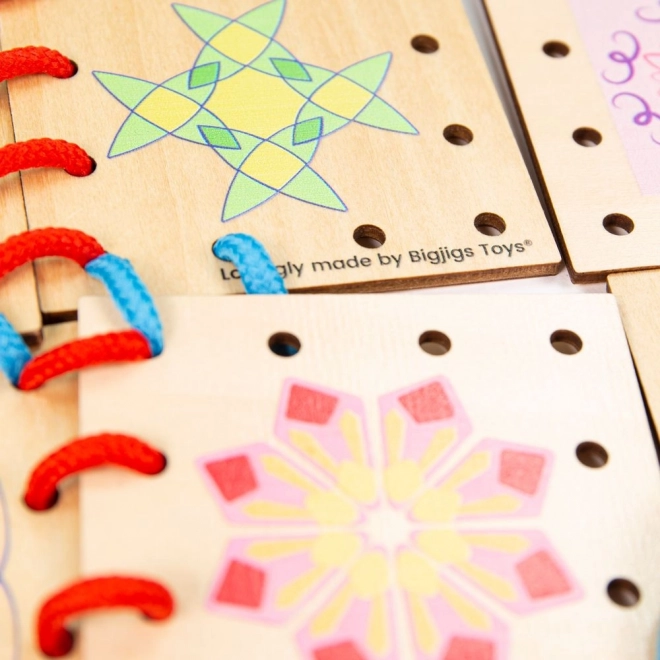 16 images à lacer en bois, ficelles textiles en 6 couleurs