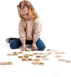 Les enfants associent des images qui vont ensemble en tant qu’opposés — par exemple jour et nuit, chaud et froid, triste et joyeux. Les pièces lisses et robustes sont faciles à tenir et à assembler, de sorte que les petites mains puissent se concentrer sur la découverte de nouveaux mots et de liens.