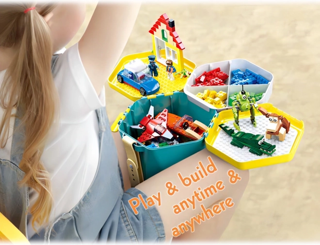 - Seau pratique – le couvercle sert de plaque de construction et l’intérieur comporte un compartiment pour trier les pièces.