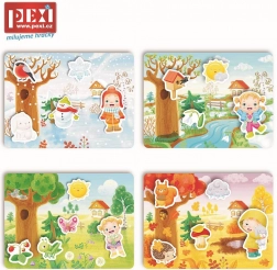 Quand faites-vous des boules de neige ? Quand pouvez-vous aller en forêt cueillir des baies et des champignons ? Le set comprend 4 grandes plaques en plastique souple avec velcro et 20 pièces individuelles à fixer sur les plaques grâce au velcro. Grâce à ce système malin, les pièces ne tomberont pas et resteront au bon endroit.