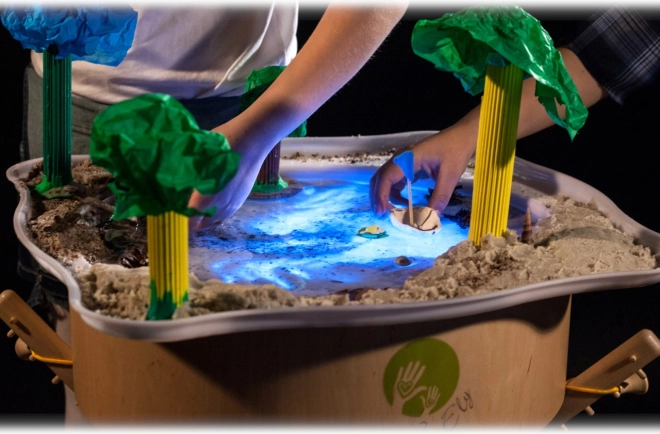 Le bac est idéal pour explorer les textures, transvaser et créer des étangs et des îlots. Il favorise la motricité fine et la concentration.