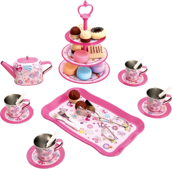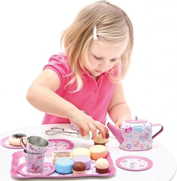 C’est l’heure d’un thé magique ! Ce riche service à thé pour enfants offre tout le nécessaire pour un moment de table ludique avec les parents, les poupées et les peluches. L’ensemble est finement décoré, fabriqué en métal léger et résistant et en plastique sûr, et développe l’imagination, la coopération et les compétences de communication. Il comprend un service pour 4 personnes et au total 35 pièces, dont un présentoir à étages pour les sucreries.