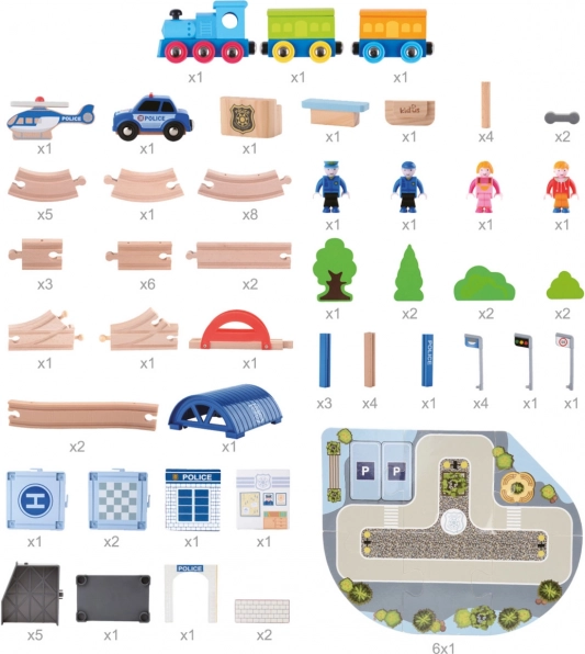 Ce circuit de train en bois richement détaillé est idéal pour les petits ingénieurs qui adorent les trains et les aventures policières. Il comprend une voie avec pont, un commissariat de police attrayant et d’autres accessoires, dont une petite voiture et un hélicoptère.