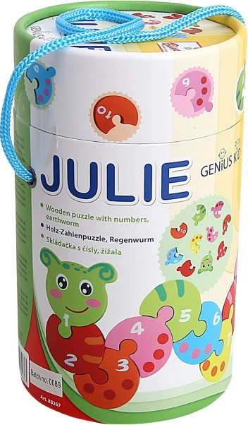 Puzzle en bois Chenille avec 10 chiffres pour enfants dès 3 ans. Bois massif durable, peintures sûres, prise en main facile et tube pratique avec sangle.