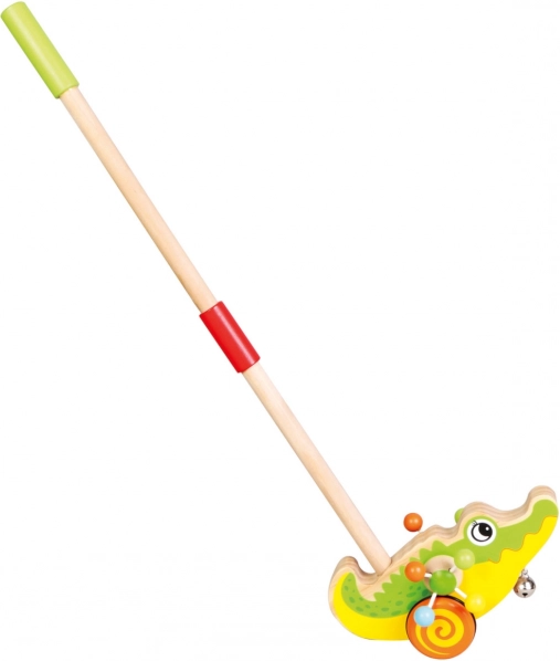 Jouet en bois de haute qualité, très apprécié, au design de crocodile. Crocodile à pousser avec bâton et grelot, émet des sons pendant le déplacement. Un jouet que l’enfant peut pousser devant lui, aidant à développer ses capacités motrices. Les enfants apprennent également ainsi à distinguer les couleurs et les animaux. Le pousseur est doté de roues revêtues de caoutchouc pour un roulement silencieux. Les enfants peuvent le pousser ou le tirer, à la maison comme à l’extérieur. Un beau cadeau pour votre enfant. Principales caractéristiques : accompagne l’enfant dans ses premiers pas, amusant et adorable, développe les capacités motrices