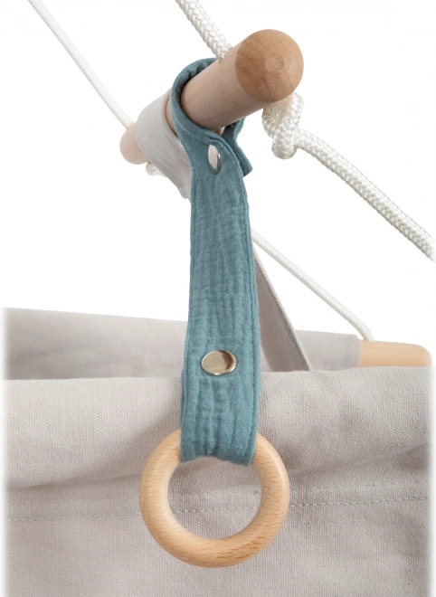 La couleur bleu fumé et le bois lisse font de la balançoire un accessoire élégant.