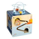 La cube propose des éléments interactifs comme des labyrinthes de perles, un labyrinthe coulissant et l’encastrement de formes, qui aident à reconnaître les couleurs et les formes.