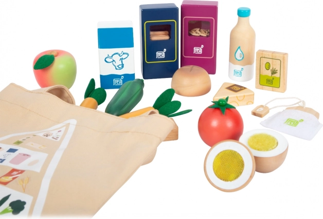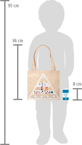 Grâce au sac en coton imprimé de la pyramide alimentaire, les enfants apprennent en s’amusant les bases d’une alimentation équilibrée, l’écologie et les achats responsables. La fabrication durable en bois et en textile est agréable en main et idéale pour les cuisines d’enfants et les stands de vente. Le set est compatible avec d’autres produits de la gamme « Fresh ».