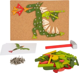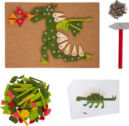 Jeu de martelage créatif pour enfants, qui développe leur motricité fine et créativité. Le set comprend un support en liège, un marteau en bois et diverses pièces en bois colorées.