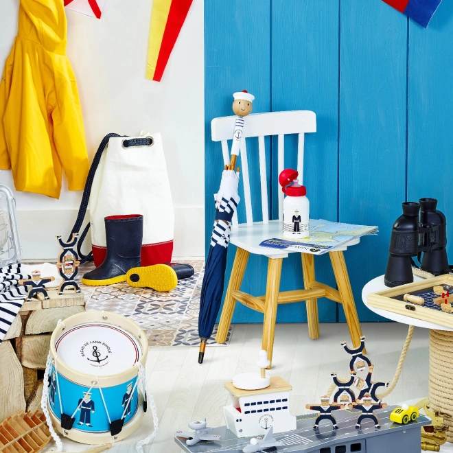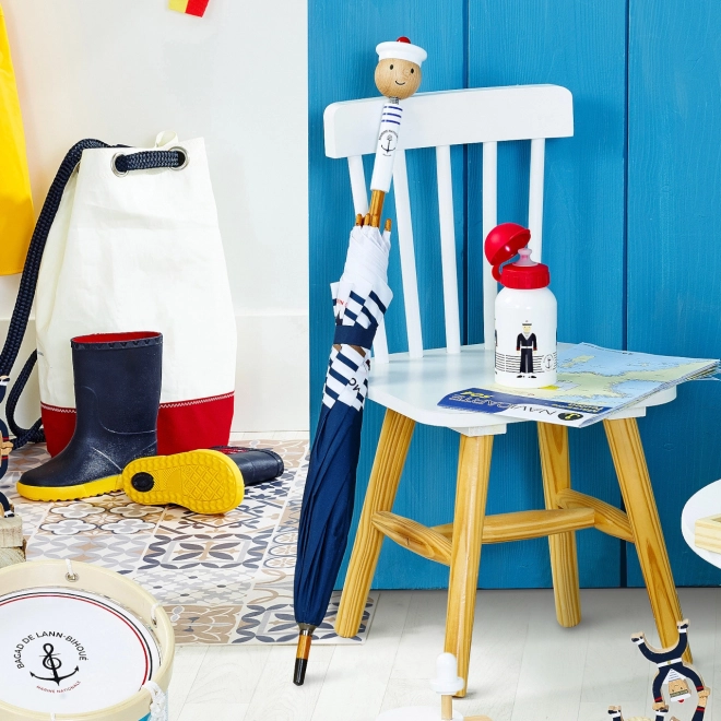 Un élégant parapluie pour enfants aux motifs marins de la marque VILAC ravira les petits comme les grands aventuriers. Grâce à la combinaison d’une structure en carbone légère, d’une poignée en bois massif avec tête montée sur ressort et d’un système de fermeture sécurisé, il est idéal pour les promenades sous la pluie. Fabriqué en France en collaboration avec la Marine nationale française.