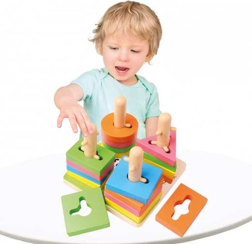 Les pièces géométriques colorées avec découpes amènent les enfants à reconnaître naturellement les formes et les couleurs, tout en développant leur logique et leur concentration.