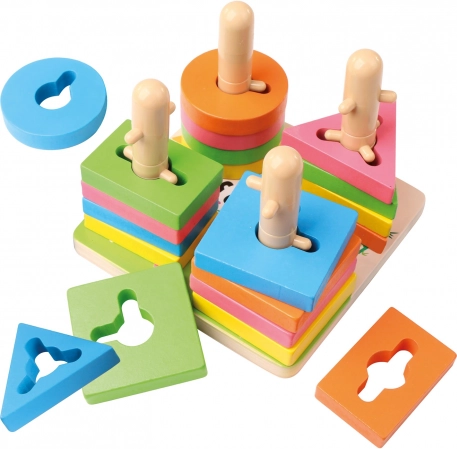 Ce jeu d’enfilage en bois de qualité offre 21 pièces colorées et une base stable avec des chevilles. Grâce aux ouvertures et tiges intelligemment conçues, les enfants exercent le pairage des formes, la reconnaissance des couleurs et la perception spatiale. Les dimensions compactes 15 × 11,5 × 15 cm assurent un rangement facile et un jeu pratique sur une table ou un tapis.