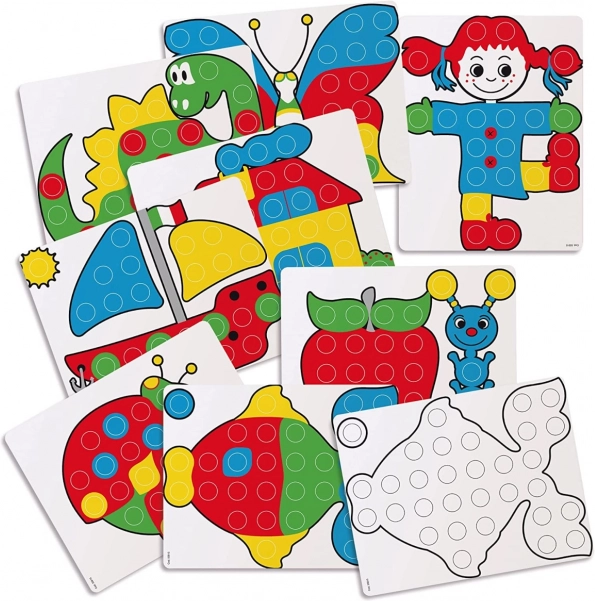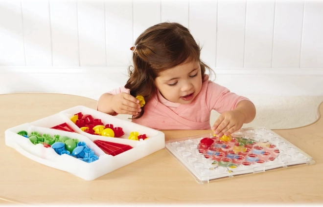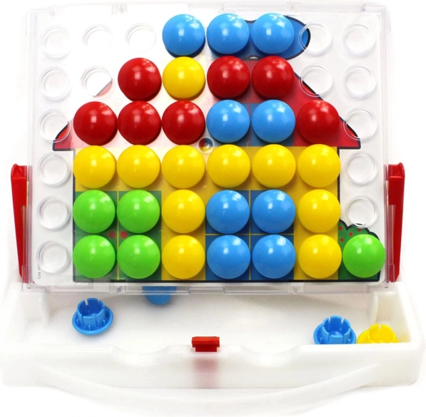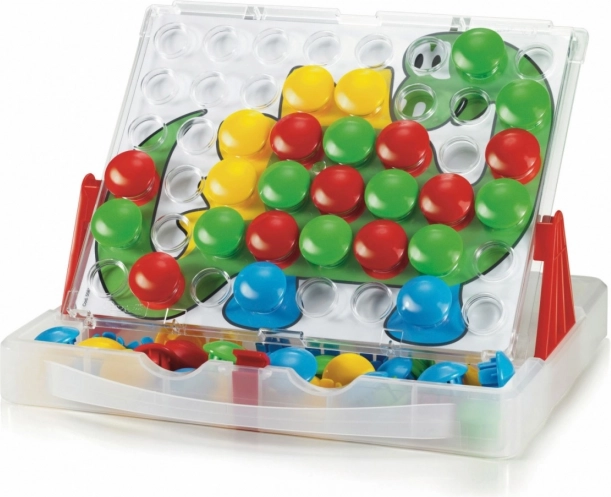 La mosaïque dans une mallette pratique permet aux enfants de créer des images joyeuses selon les modèles fournis ou selon leur propre imagination. La plaque peut être glissée dans des supports et utilisée aussi en position verticale pour un jeu encore plus confortable. De grands pions colorés sont sûrs et faciles à saisir même pour les petites mains.