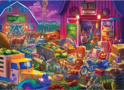 Une scène colorée riche en détails – grange avec l’inscription For Sale, animaux de la ferme, vieux camion chargé de récolte et décorations saisonnières. Idéal pour les amateurs de thèmes champêtres et d’illustrations travaillées.