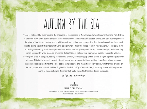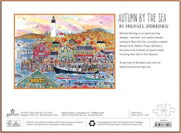 Profitez de la magie d’une petite ville côtière aux premiers jours d’automne avec le puzzle artistique Automne au bord de la mer de GALISON. L’illustration de Michael Storrings séduit par ses couleurs chaleureuses et ses nombreux détails, pour un défi agréable. Carton de qualité issu de matériaux recyclés, finition mate et impression non toxique pour une expérience premium d’assemblage. La taille de l’image assemblée est de 69 × 51 cm, recommandé à partir de 8 ans.