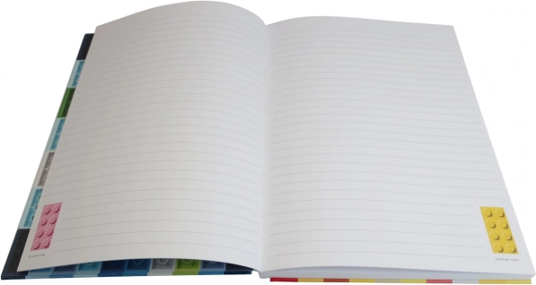 Chaque page lignée comporte l’illustration d’une brique dans une teinte LEGO précise, rendant l’écriture plus agréable et stimulant la créativité.