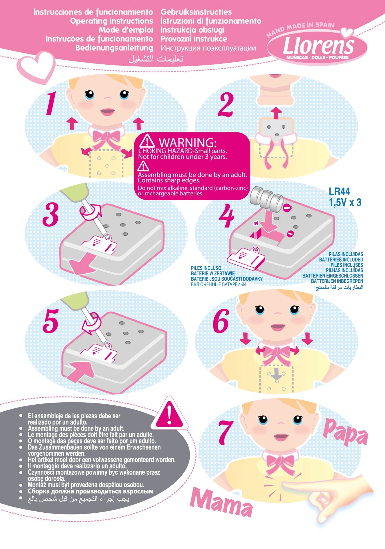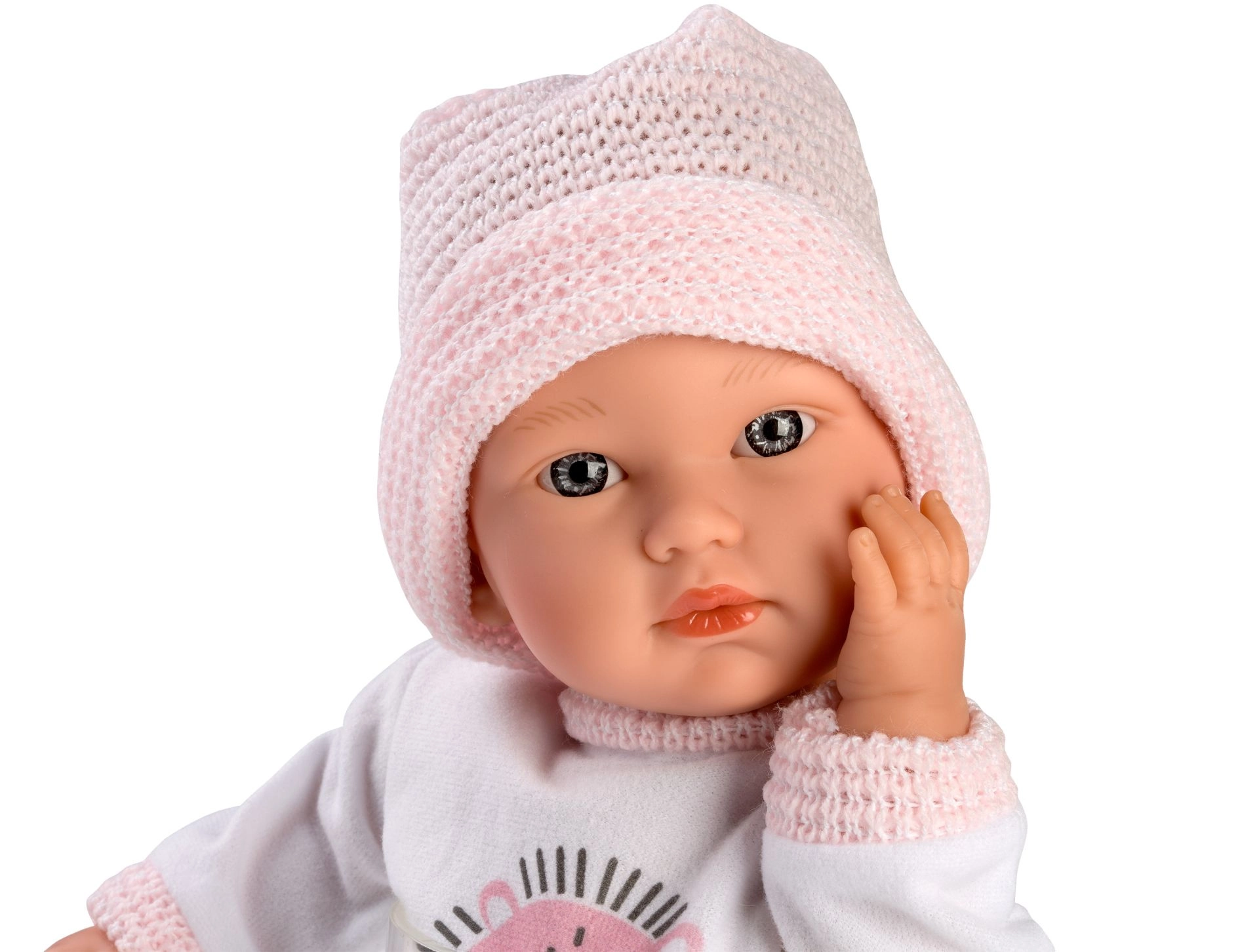 En appuyant sur le ventre, la poupée pleure et appelle « maman, papa », favorisant un jeu empathique et le développement des compétences sociales. La tenue à motif et le bonnet tricoté s’enfilent et se retirent facilement, ce qui développe la motricité fine.