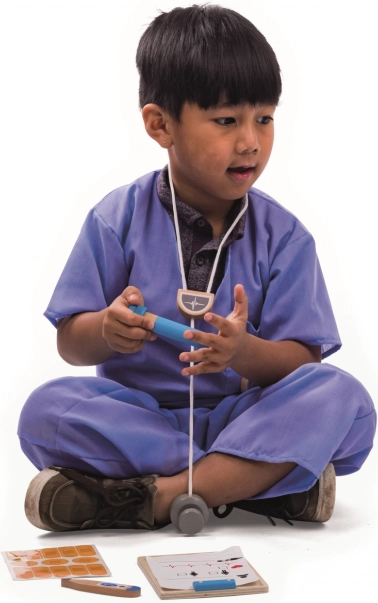 Le costume de médecin pour enfants de BIGJIGS TOYS transforme chaque jeu en mission de sauvetage. Il comprend un t-shirt bleu et un pantalon à scratchs pour un habillage et déshabillage faciles, ainsi que de riches accessoires : stéthoscope en bois, pochette/planche médicale pour les notes, thermomètre, montre de poche, seringue et pansements. Le costume est fabriqué en coton et polyester et peut être lavé en machine.