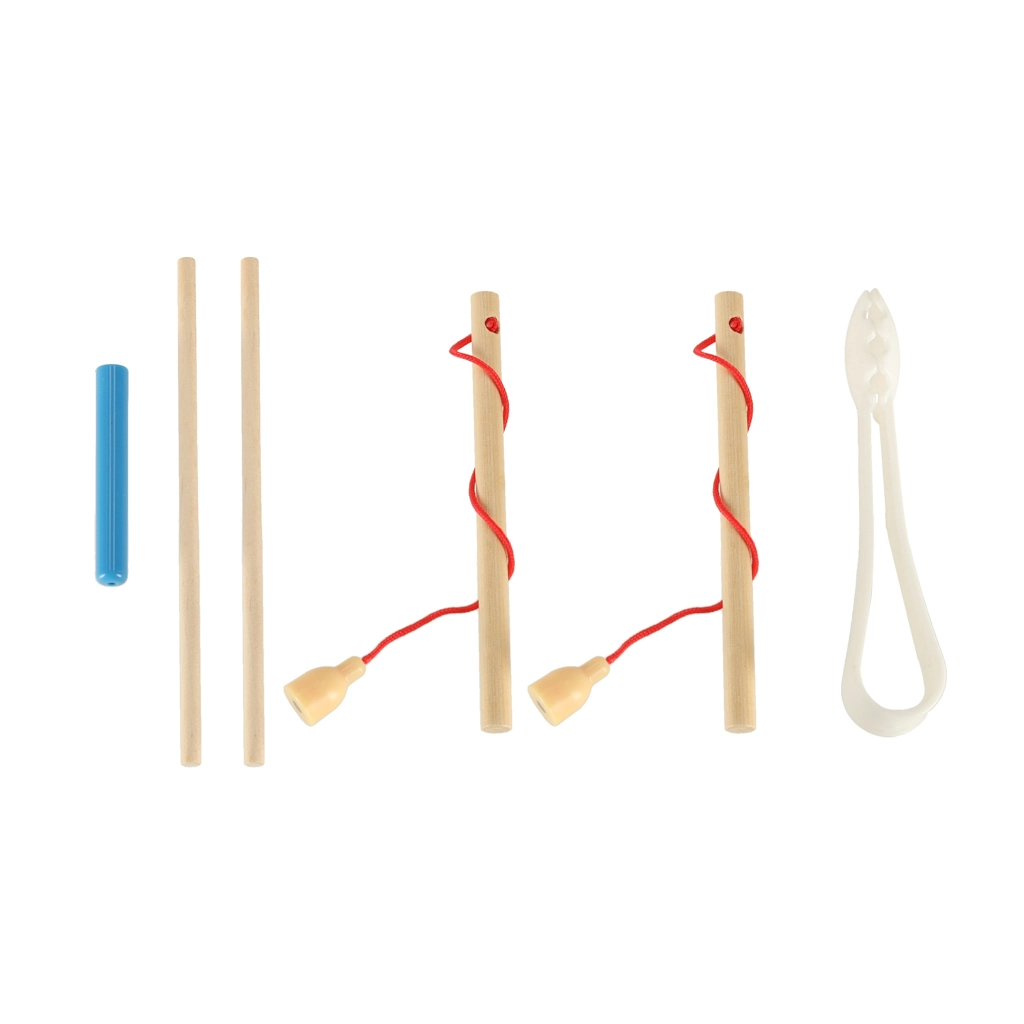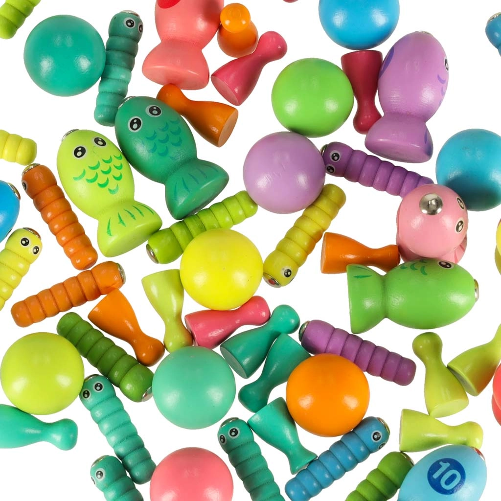 - 1× base en bois, 2× canne, 2× bâtonnets, 1× pince, 4× coupelle en silicone, 10× bille en bois, 12× poissons, 17× chenilles, 16× pions en 4 couleurs, 1× dé