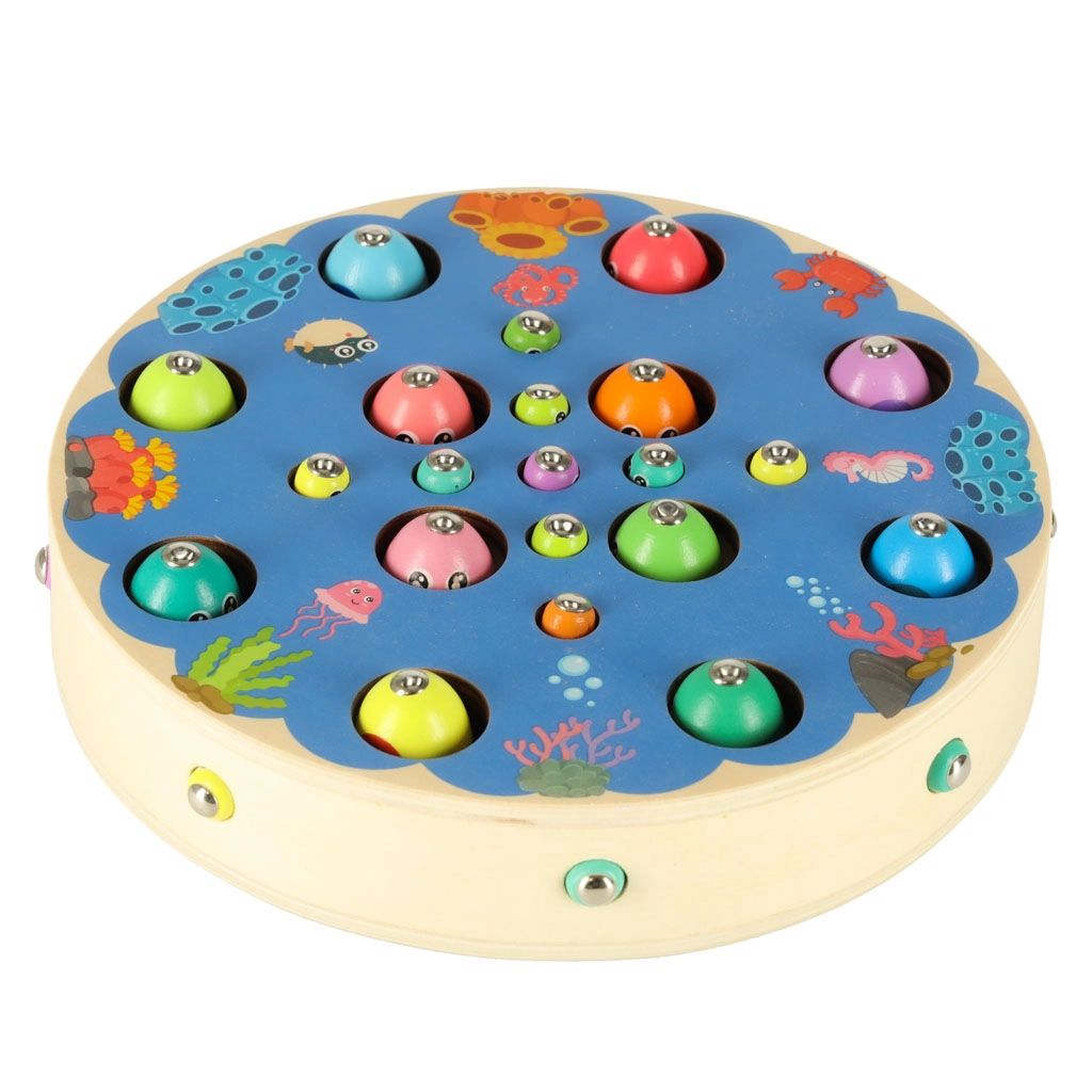Les enfants attrapent des poissons et des chenilles colorés avec des cannes magnétiques – ils entraînent la précision, la patience et la coordination œil-main de manière ludique.
