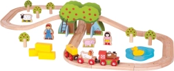 Le circuit de train comprend un ensemble complet avec un environnement agricole, incluant des figurines de fermiers et d'animaux.