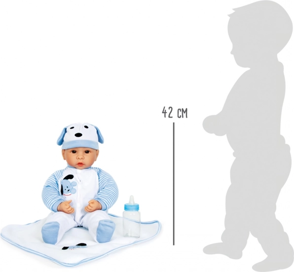 Poupée Beno est le compagnon idéal pour tous les enfants qui aiment les chiens. Cette poupée réaliste est habillée d’une adorable tenue bleu et blanc à motif de chiot et est fournie avec un biberon et une tétine.