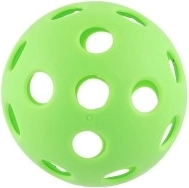 La balle est fabriquée en plastique léger avec des ouvertures pour réduire la résistance de l’air, ce qui facilite son contrôle pendant le jeu.