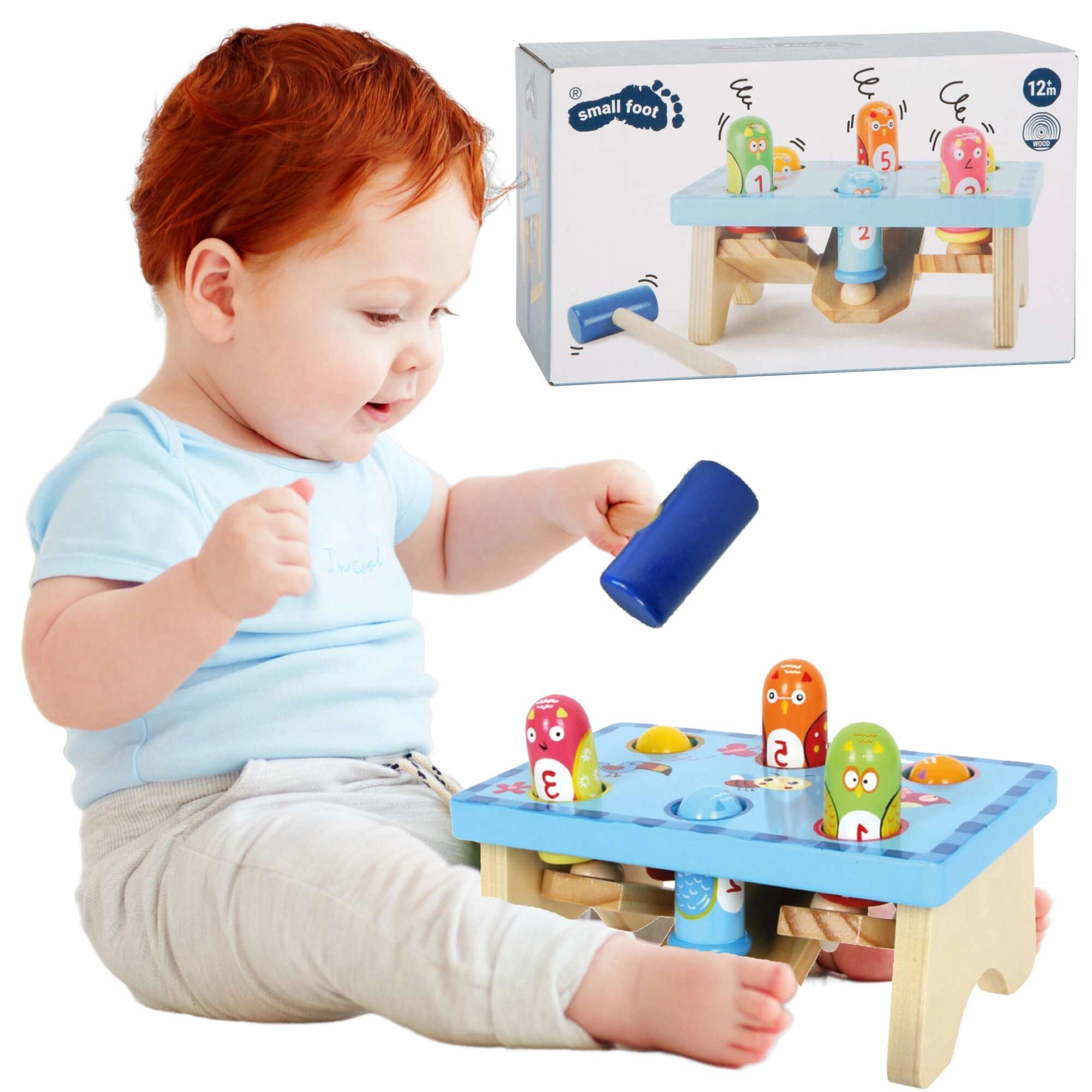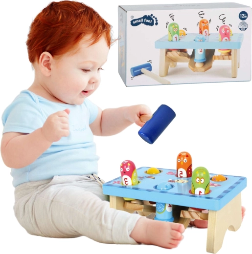 Amusant banc à marteler en bois de la marque Small Foot au motif d’oiseaux, qui développe la motricité et la concentration des enfants. Il comprend un banc stable de couleur bleu clair, des chevilles colorées et un marteau en bois. Le jouet favorise la coordination œil-main, la précision des frappes et l’apprentissage des couleurs et des chiffres. Il est fabriqué en bois de qualité et convient aux enfants à partir de 18 mois.