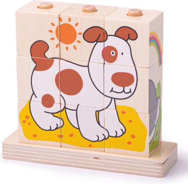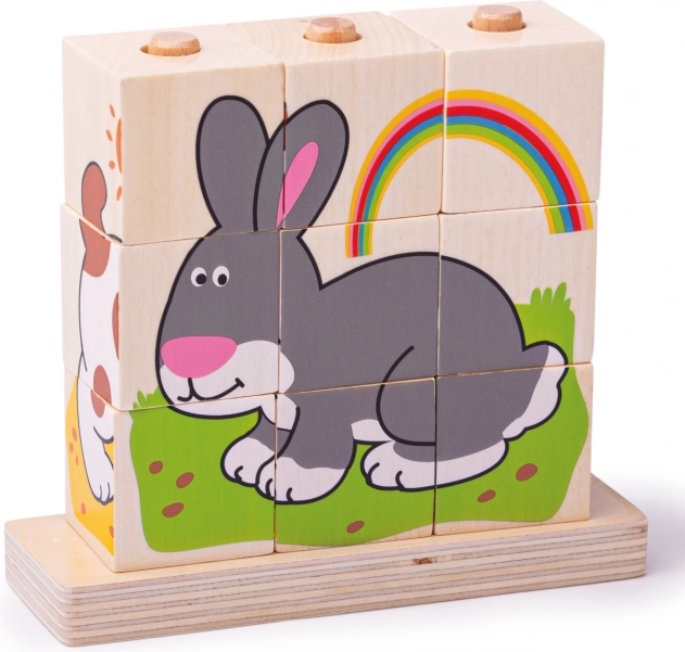 Le set comprend au total 10 pièces – 9 cubes qui composent 4 images différentes, et une base en bois avec tiges pour un empilage sûr et ordonné. Le jouet est fabriqué en bois durable à surface lisse et répond aux normes européennes de sécurité actuelles.