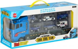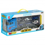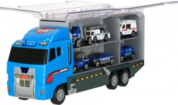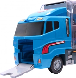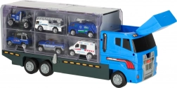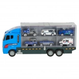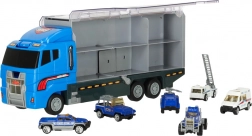 Le grand camion bleu combine la fonction de stockage avec la possibilité de jouer. Permet de transporter jusqu'à 14 petites voitures métalliques, qui font partie du pack. Les petites voitures imitent de manière réaliste les véritables voitures de police et d'urgence. Le camion a deux côtés avec des portes transparentes et des verrous de sécurité, garantissant que les voitures ne tombent pas pendant le transport. Contient également un lanceur de petites voitures à l'avant, ajoutant une autre dimension au jeu.