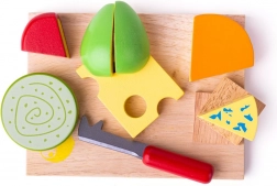 Le bois est le principal matériau de cet ensemble de fromages finement travaillé. Les enfants peuvent essayer le rôle de chef avec les pièces de fromage en bois colorées, qui ressemblent à de vrais fromages. Le set comprend non seulement des fromages, mais aussi un couteau et des biscuits, pour imiter parfaitement le service des fromages. Les pièces en bois encouragent un jeu créatif et aident également à développer la motricité fine des enfants.