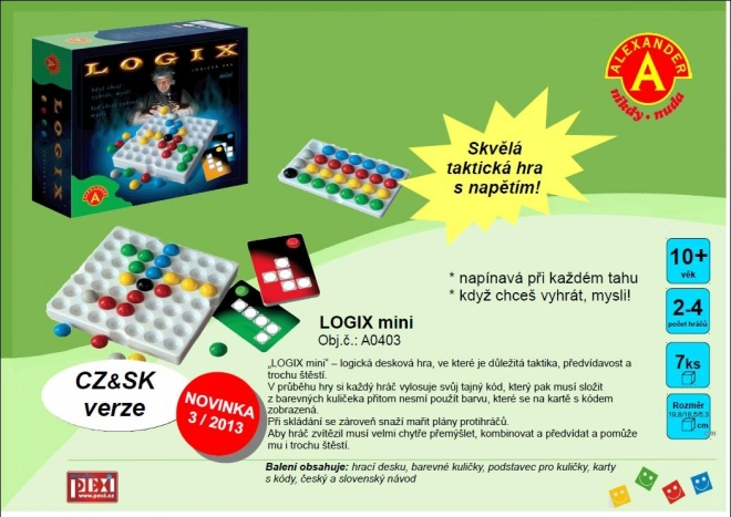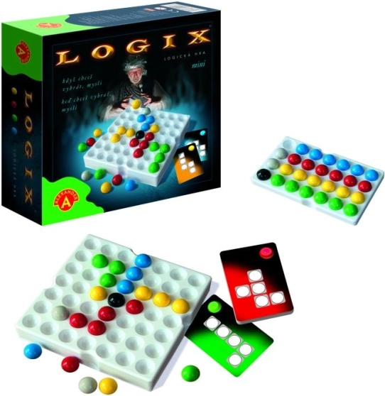 Jeu de logique pour 2 à 4 joueurs à partir de 10 ans. Chaque joueur compose un « code secret » à partir de billes colorées. Les cartes déterminent la forme et le nombre de billes du code secret. Construis ton code et démolis celui de ton adversaire en même temps. Si tu veux gagner, réfléchis – le premier code complet remporte la partie ! Chaque joueur pioche au début une carte indiquant la disposition des billes du code secret. Pendant la partie, les joueurs tentent, en posant ou en déplaçant des billes, de reconstituer leur code. Le but du jeu est d’ajouter et de déplacer le plus rapidement possible des billes sur le plateau conformément au modèle (code) de la carte piochée. Profite des billes de l’adversaire et démolis son code avant qu’il ne le termine. La couleur affichée sur la carte t’indique la couleur interdite que tu ne peux pas utiliser. Place la dernière bille de ton motif, crie « Maître Logix ! » et tu as gagné. Contenu de la boîte : plateau de jeu, billes colorées (vert, bleu, jaune, rouge, gris, noir), réservoir pour billes, cartes avec codes secrets, règles en tchèque et en slovaque. Principales caractéristiques : développe la pensée logique des enfants, convient aux enfants à partir de 10 ans. Documentation : règles du jeu CZ, règles du jeu SK