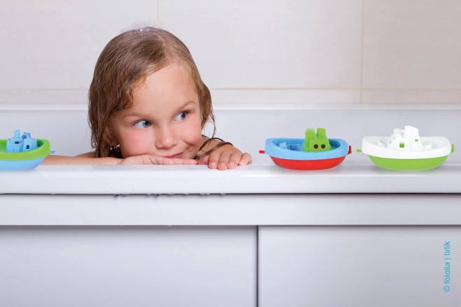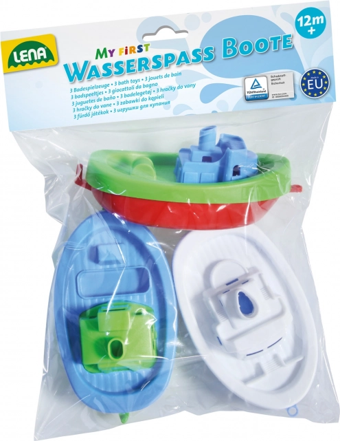 Trois bateaux colorés qui flottent et peuvent être utilisés dans la baignoire, la petite piscine ou sur la terre ferme. Leur forme simple et leurs couleurs vives invitent au jeu.