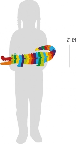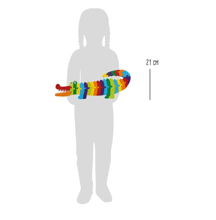 Un puzzle coloré en bois en forme de crocodile aide les enfants à apprendre de manière ludique l’alphabet et les couleurs. L’ensemble comprend 26 pièces portant les lettres A–Z qui s’assemblent pour former une silhouette complète. Des bords lisses et arrondis et des matériaux sûrs certifiés CE assurent un jeu confortable et sécurisé. Idéal pour développer la motricité fine et la coordination œil–main, parfait à la maison comme en maternelle.