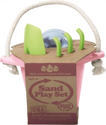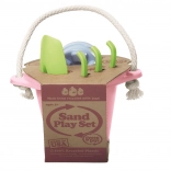Green Toys propose des jouets responsables en plastique 100 % recyclé, sans PVC, bisphénol ni phtalates. Ce set de sable rose contient :