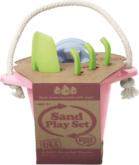 Green Toys propose des jouets responsables en plastique 100 % recyclé, sans PVC, bisphénol ni phtalates. Ce set de sable rose contient :