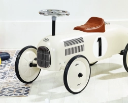 Cette draisienne pour enfants au look de voiture de course séduit par son charme rétro et sa fabrication métallique de qualité. Elle offre une conduite silencieuse grâce aux roues caoutchoutées, une direction facile avec volant et une structure robuste avec une capacité de charge de 20 kg – idéale pour les petits pilotes dès 1,5 an.