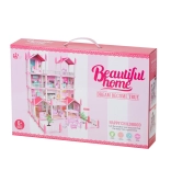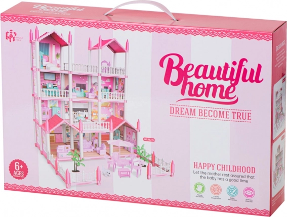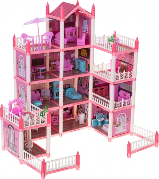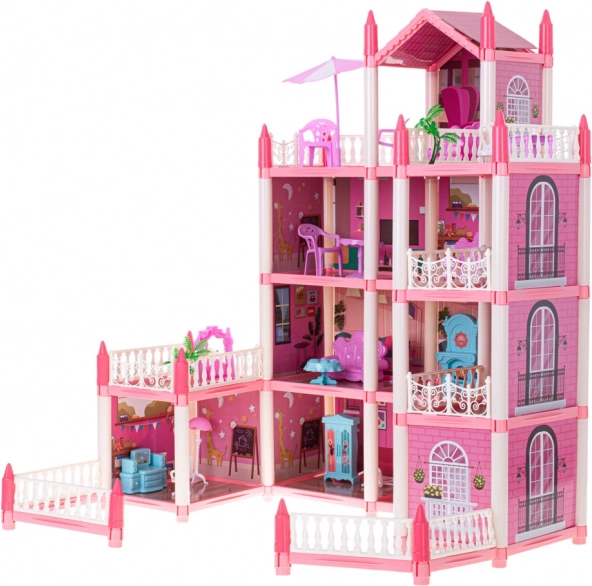 La villa rose pour poupées possède quatre étages, offrant des pièces fascinantes et variées à explorer.