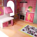 Les pièces soigneusement poncées garantissent un jeu sûr sans échardes. Les portes ouvrantes des placards de cuisine, le berceau à bascule, la table avec chaises et l’armoire stimulent l’imagination et développent la motricité fine ainsi que les compétences sociales lors du jeu et de l’aménagement en commun.