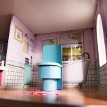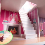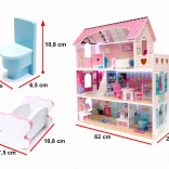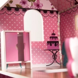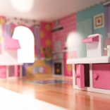 La maison propose trois niveaux avec cinq pièces, escaliers et petits balcons. Les impressions colorées sur les murs et les sols créent une atmosphère chaleureuse propice au jeu imaginatif.