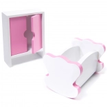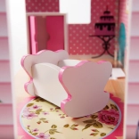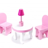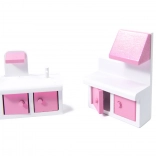 Inclus, 9 pièces de mobilier : armoire, berceau, lampe, 2 chaises, table, cuisine avec hotte, meuble avec évier et toilettes – prêt pour jouer immédiatement.