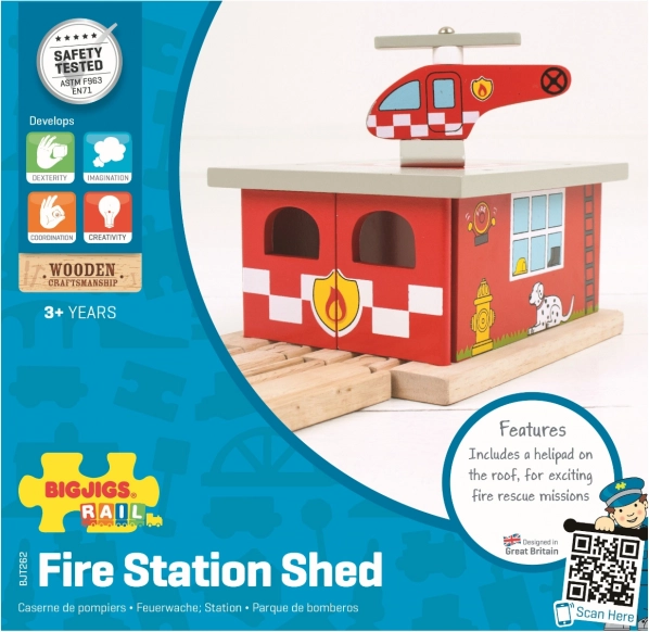 Élargissez l’univers ferroviaire des enfants avec un dépôt de pompiers avec héliport plein d’action. Des marquages détaillés, une structure traversante et l’hélicoptère inclus invitent à des histoires palpitantes et des missions de secours. La station est soigneusement fabriquée en bois de qualité et répond aux normes de sécurité européennes.