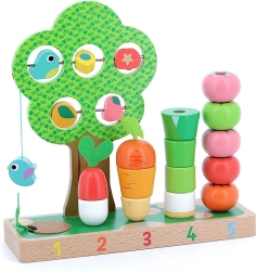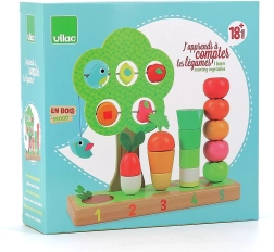 Ce jouet en bois de qualité réunit amusement et apprentissage. Les enfants empilent et enfilent carottes, poireaux, petites tomates et d’autres formes sur des chevilles numérotées de 1 à 5, acquérant naturellement le comptage ainsi que le tri par couleurs et tailles. Un petit arbre avec éléments coulissants est inclus pour explorer et entraîner la coordination œil–main.