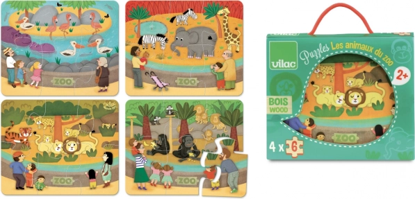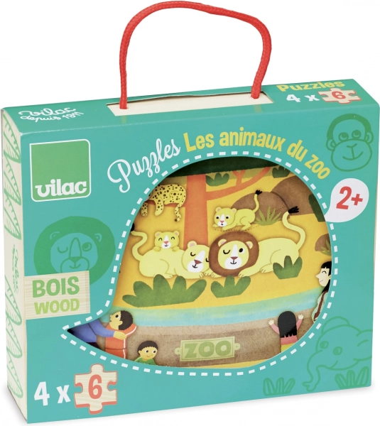 Puzzle en bois sur le thème du zoo offrant un divertissement pour les enfants dès 2 ans. Il comprend quatre puzzles, chacun composé de six pièces, et est rangé de manière pratique dans une boîte en bois avec une poignée en coton.