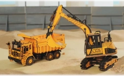 • Éléments réalistes d’engin de chantier : bras combiné, « hydraulique », godet, chenilles et cabine rotative à 360°.