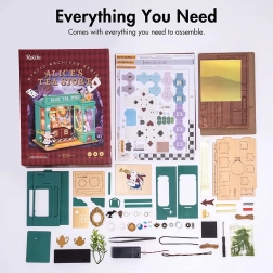 La construction est pensée pour le plaisir de créer : la boîte contient les matériaux pour fabriquer le mobilier et les petits accessoires, de la colle, une pince en plastique et un guide illustré en anglais. Grâce à la forte proportion de pièces terminées, l’assemblage est fluide et le résultat est une scène richement détaillée avec porcelaine, pâtisseries et décorations thématiques.