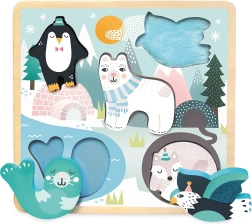 Ce puzzle sensoriel en bois sur le thème des animaux polaires (pingouin, ours blanc, phoque, baleine et petit oiseau) invite les enfants à la joie de la découverte. Une fois les pièces massives retirées, ils explorent des textures variées sous les supports, ce qui développe la perception des surfaces et les aide à différencier formes et matériaux. Sa conception robuste en bois est durable et facile à saisir même pour les plus petites mains.