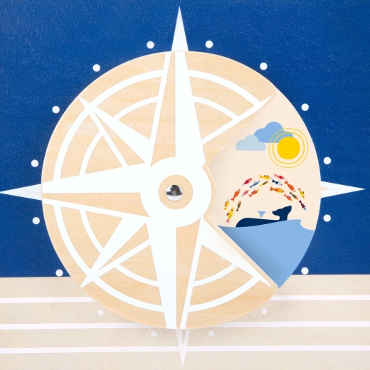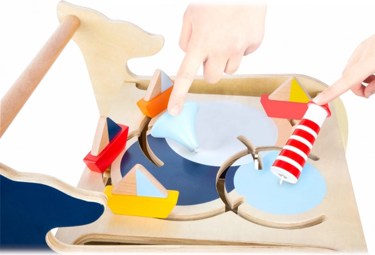 - Monde marin : Le chariot s’inspire de l’univers de la mer et inclut des activités telles que l’encastrement de formes, la rotation d’images et une ardoise de dessin.