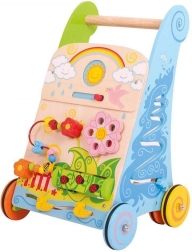 Sur le panneau avant, les enfants alternent le soleil et la lune, font tourner une fleur colorée, alignent trois coccinelles ou bourdons en faisant pivoter les cubes et guident la coccinelle, le bourdon et le papillon dans le labyrinthe de perles. Sur les côtés, un dauphin à faire glisser et un trieur de formes avec trois pièces colorées (chacune avec un animal différent) attendent. Sans oublier de joyeux canetons prêts pour une promenade aquatique.
